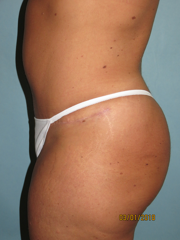 The patient is a 35-year-old female with two children requiring abdominal wall tightening and excess skin removal and hip liposuction. The photo shows her at four months following Vaser Liposuction of the flanks and the hips, skin removal and abdominal wall tightening with a full abdominalplasty.