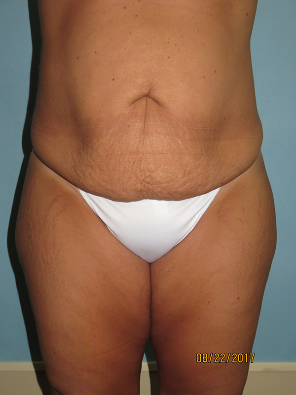 Patient is a 38-year-old with three children presenting with flank/hip fat, loose abdominal skin with weak abdominal wall and descent of the pubic area. Patient underwent a flank/hip Vaser Liposelection, upper abdominal fat contouring and upper abdominal wall tightening along with abdominal skin removal and pubic area contouring and lift.